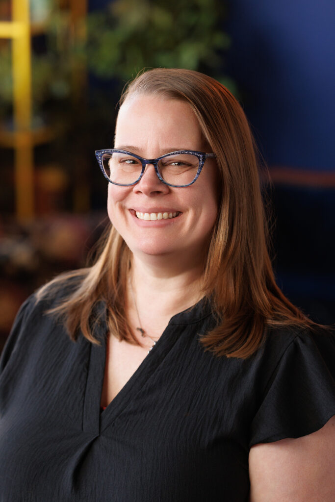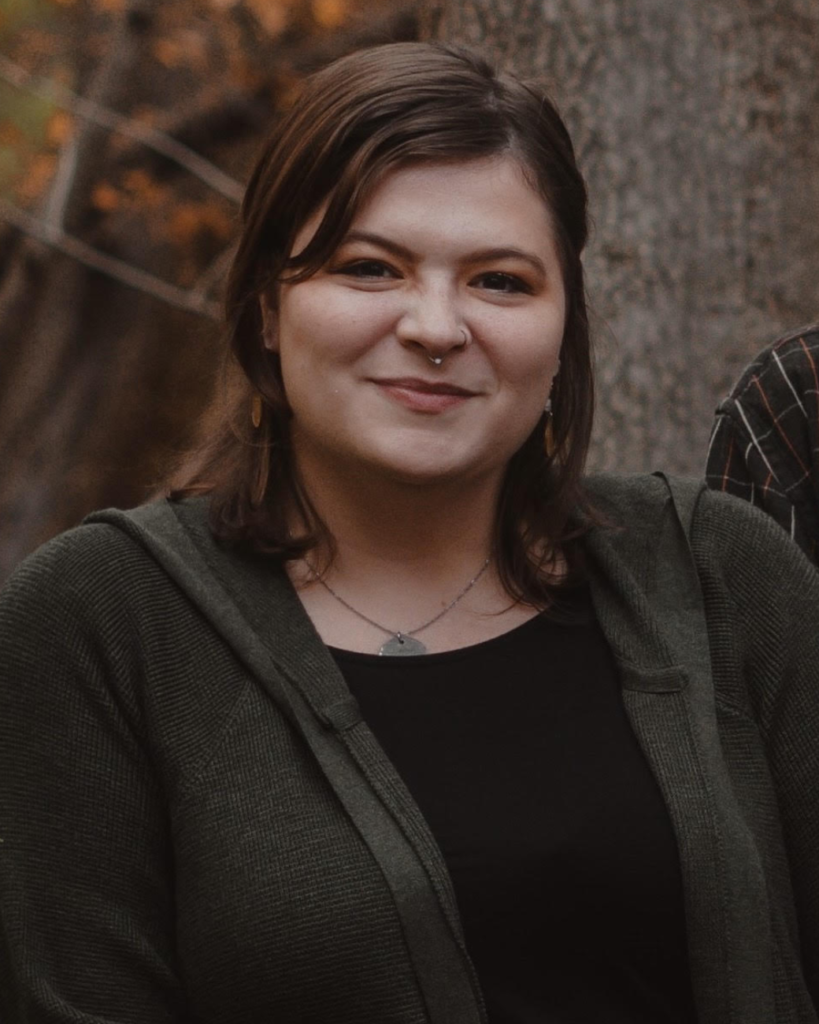 Image description: A white woman in her mid 20s with shoulder length dark brown hair and brown eyes looking at the camera and smiling. She is wearing a black shirt and dark green cardigan. She has a nose ring and septum ring.